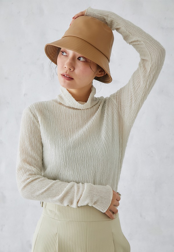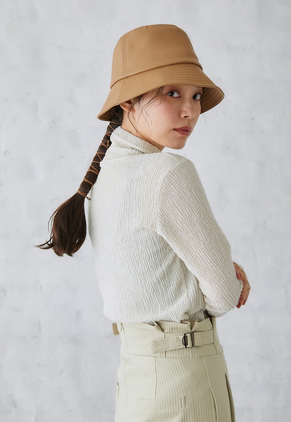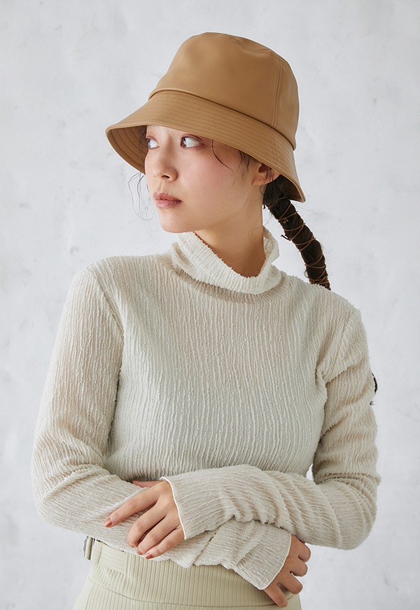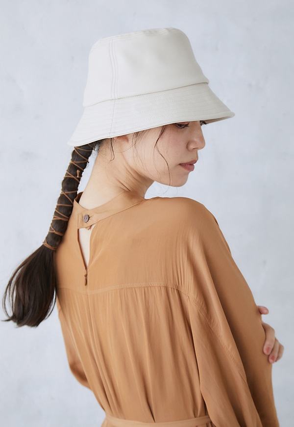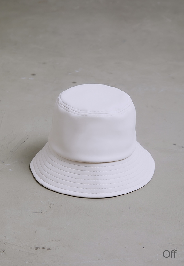 艶のあるフェイクレザーを使用したバケットハットです。高級感のある素材を使っているので、カジュアル感と上品さが程よくMIXされ、コーディネートのポイントになるアイテムです。内側のマジックテープでサイズ調整が可能です。