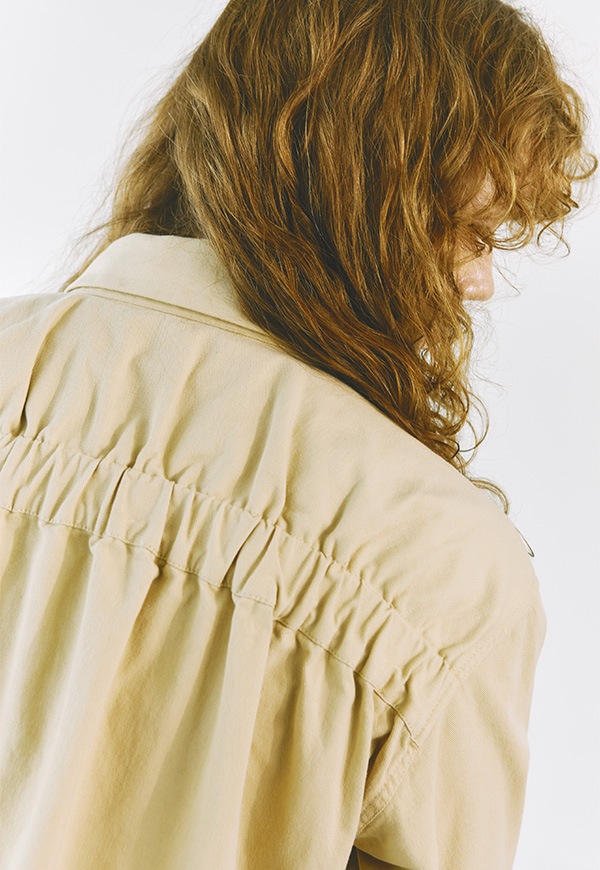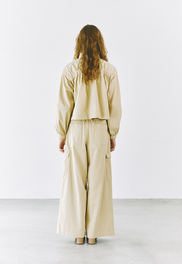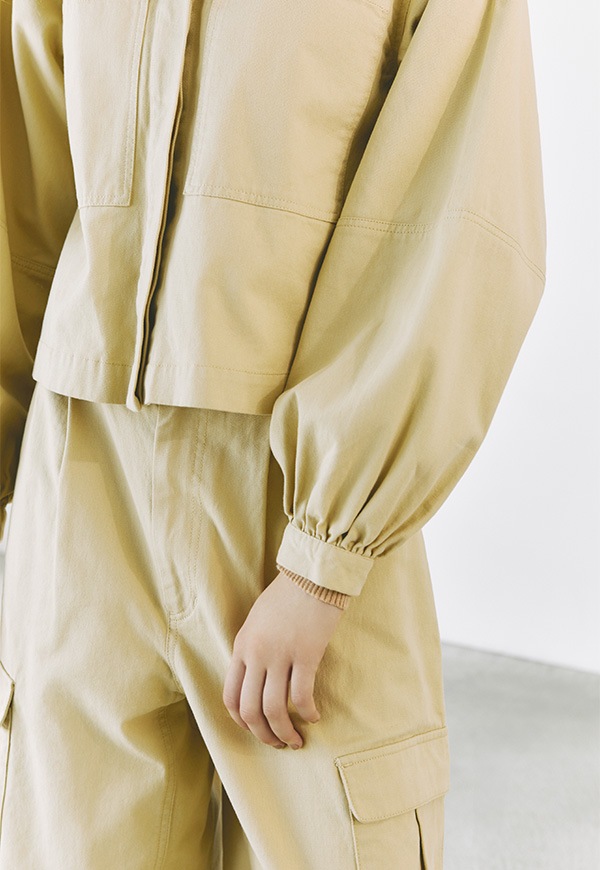 大きめの両胸ポケットと後ろのシャーリングデザインがアクセントになったショート丈ジャケットです。