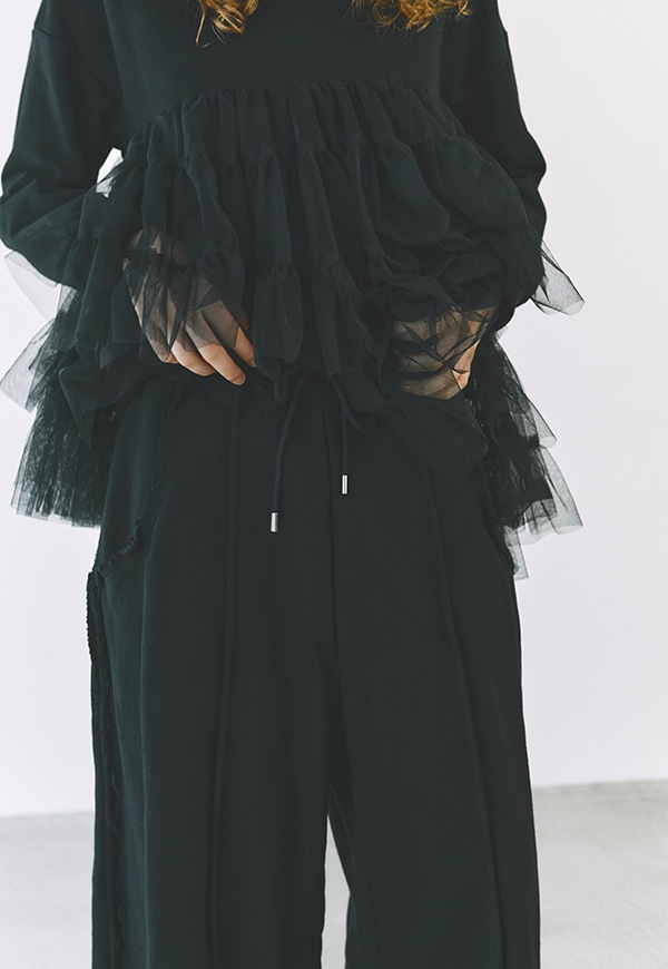 ボリューム感のあるチュールフリルがカジュアルな中にも上品さをプラスし、おしゃれな着こなしを楽しめます。