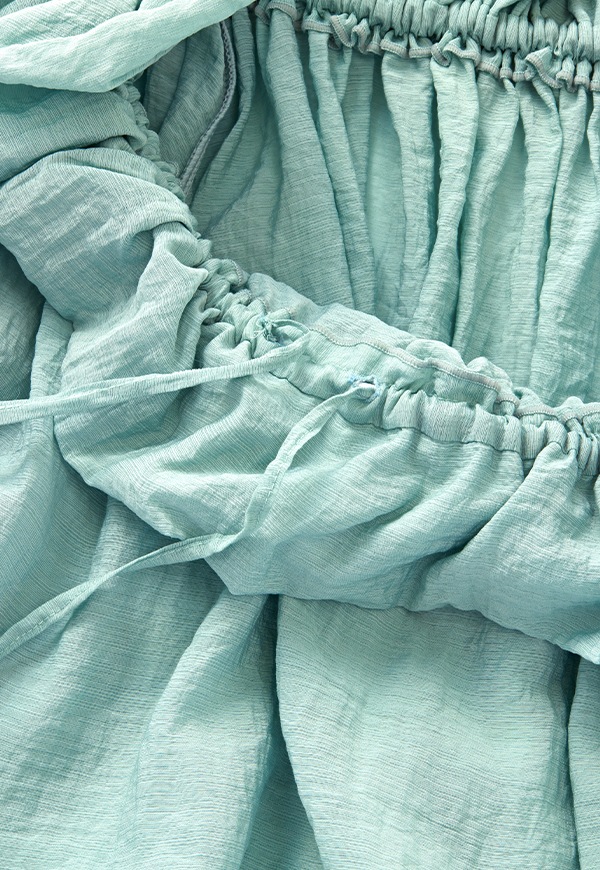 フリル部分にはゴムと紐を通しており、絞り具合によってギャザーの分量を調整可能。
