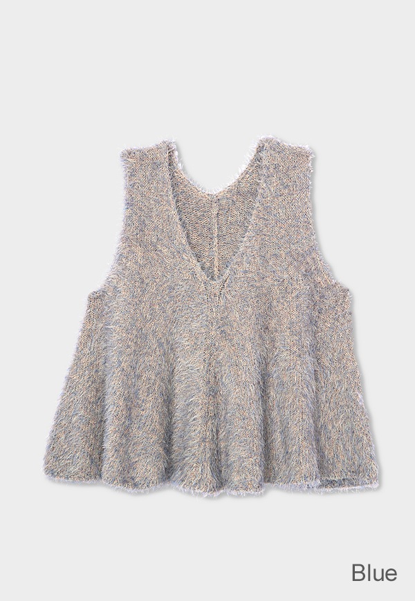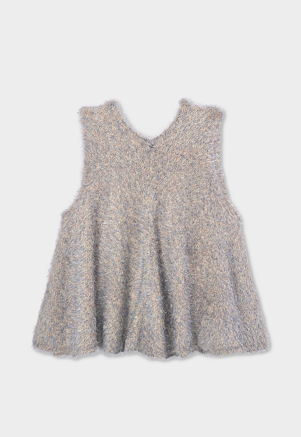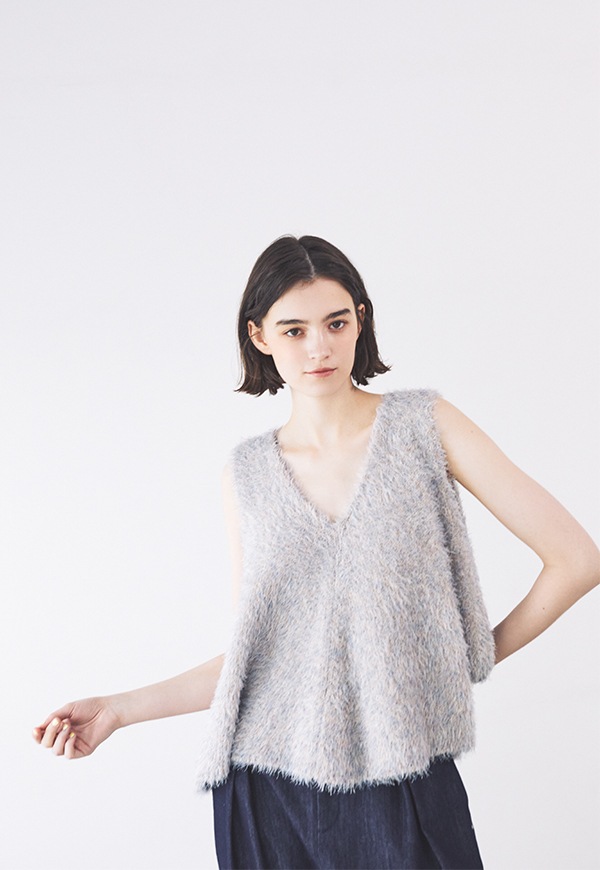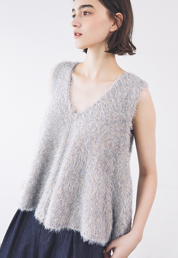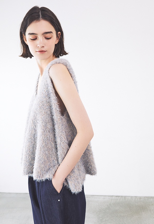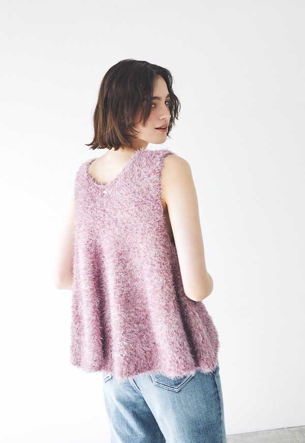 毛足のある素材を活かした、立体的なフレアシルエットのノースリーブニット。