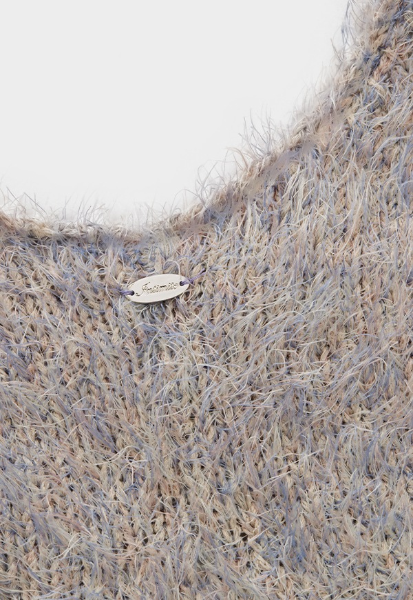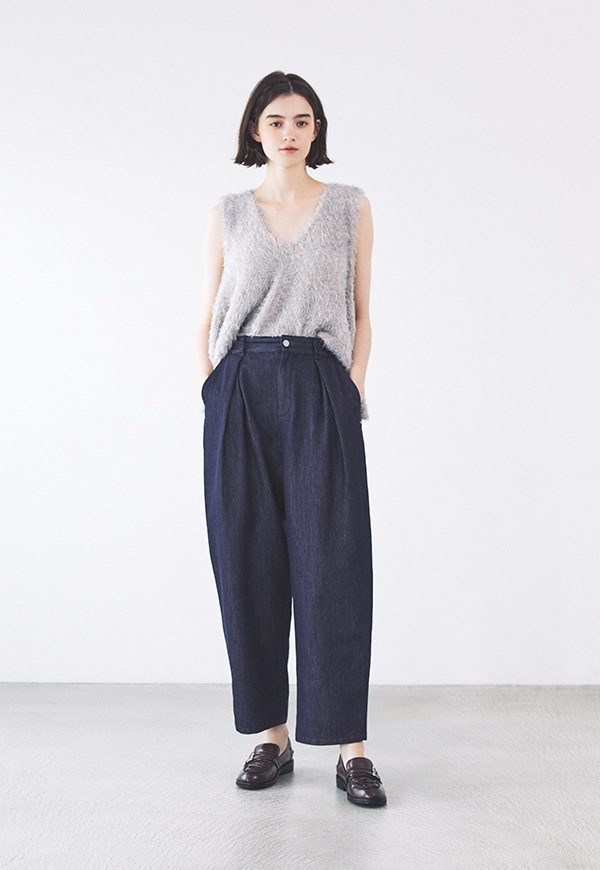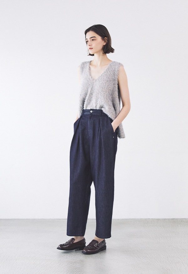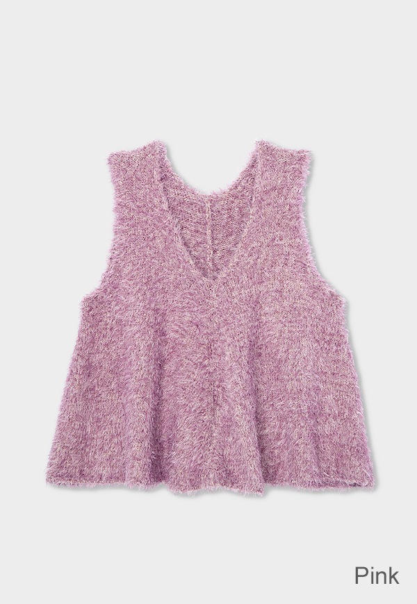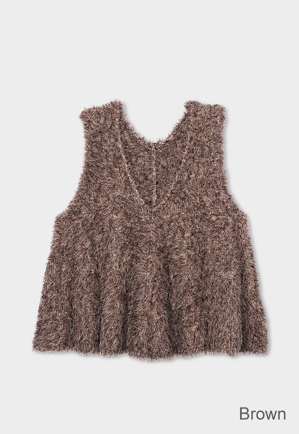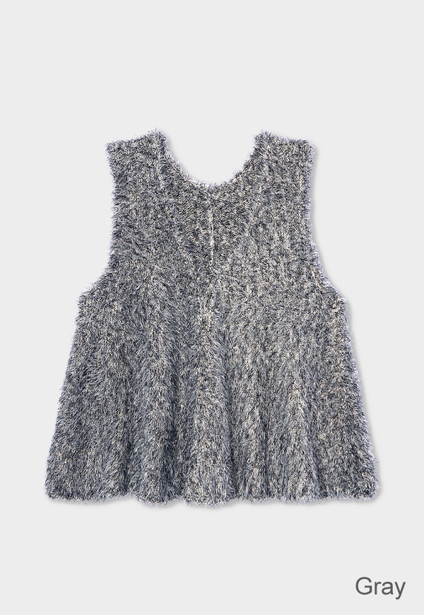 毛足のある素材を活かした、立体的なフレアシルエットのノースリーブニット。