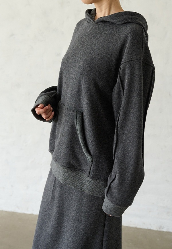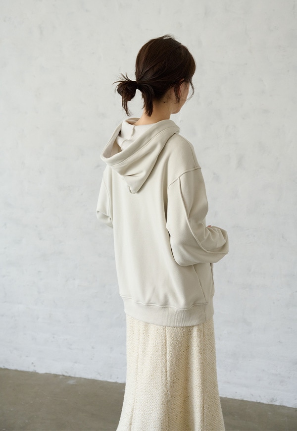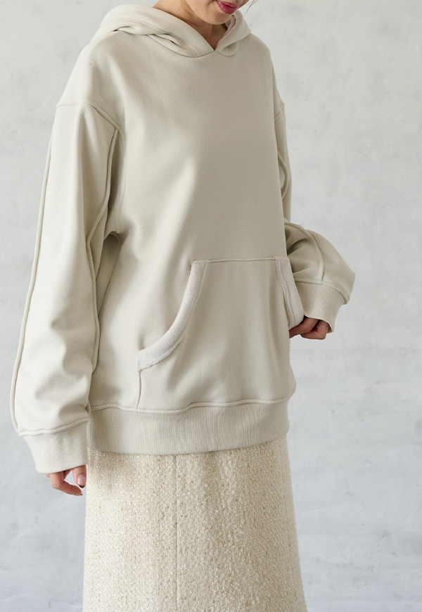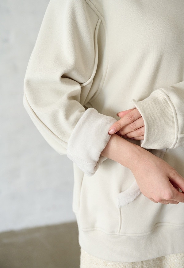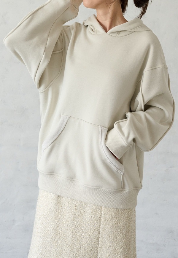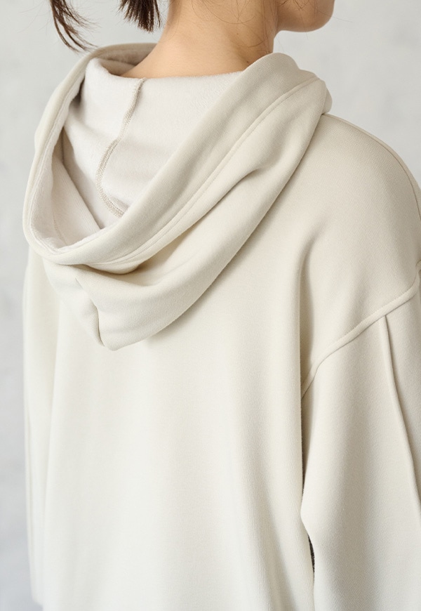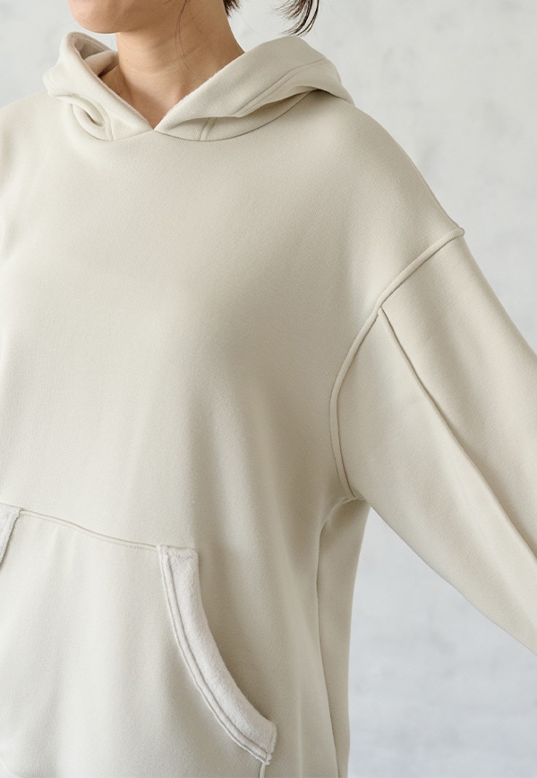 「着用すると気持ちの良いこと」をコンセプトに作った、裏側が肌触りの良い起毛素材のスウェット生地です。部屋の中と外の境界線をなくすような、常に包まれているような安心感を感じる素材です。裏側が起毛加工されているので、温かさが違います。