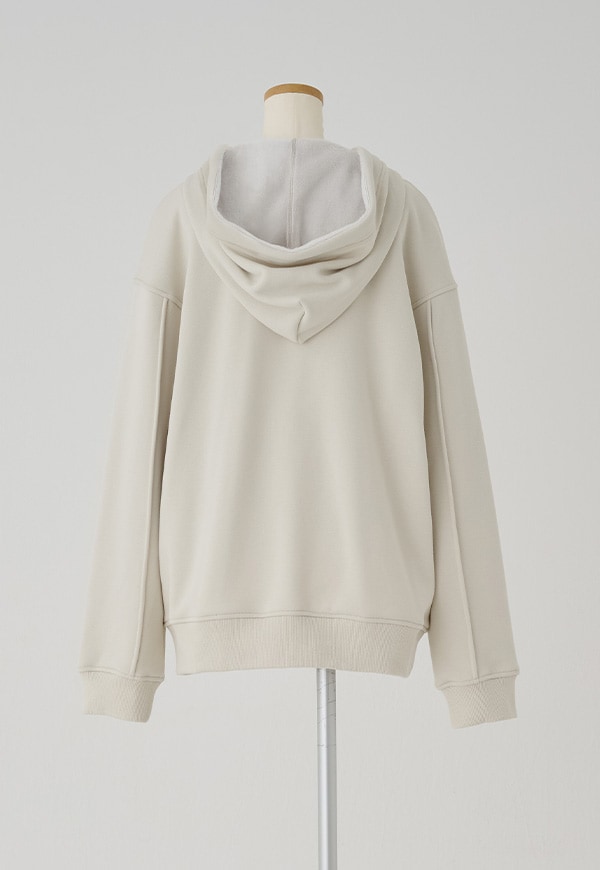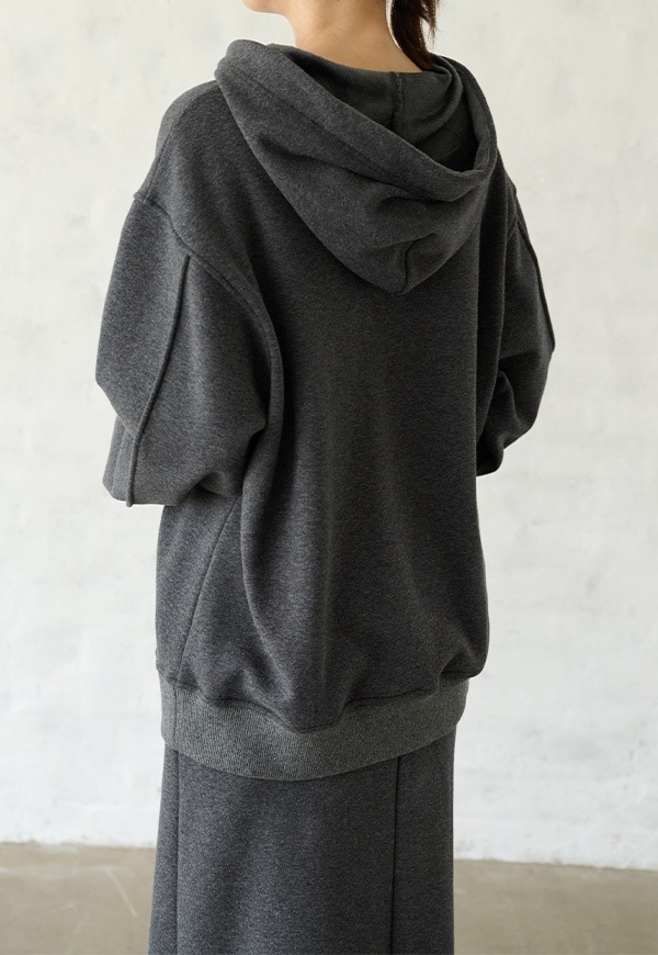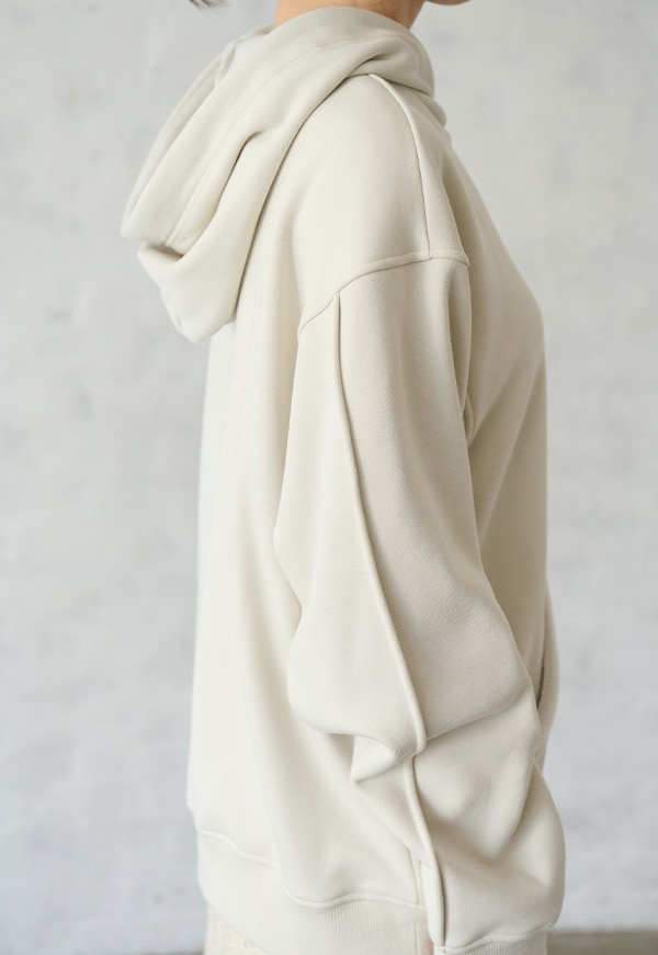 心地の良い素材の良さを損なわないように、フードを1枚仕立てにするなど軽く仕上がるように考慮をしてデザインをしました。シンプルになり過ぎないように、袖部分は布をつまんでアクセントデザインを入れました。