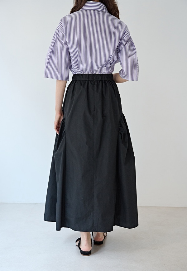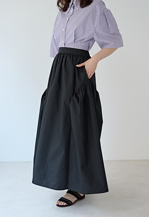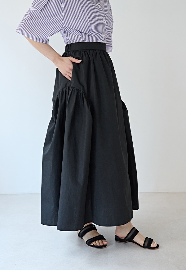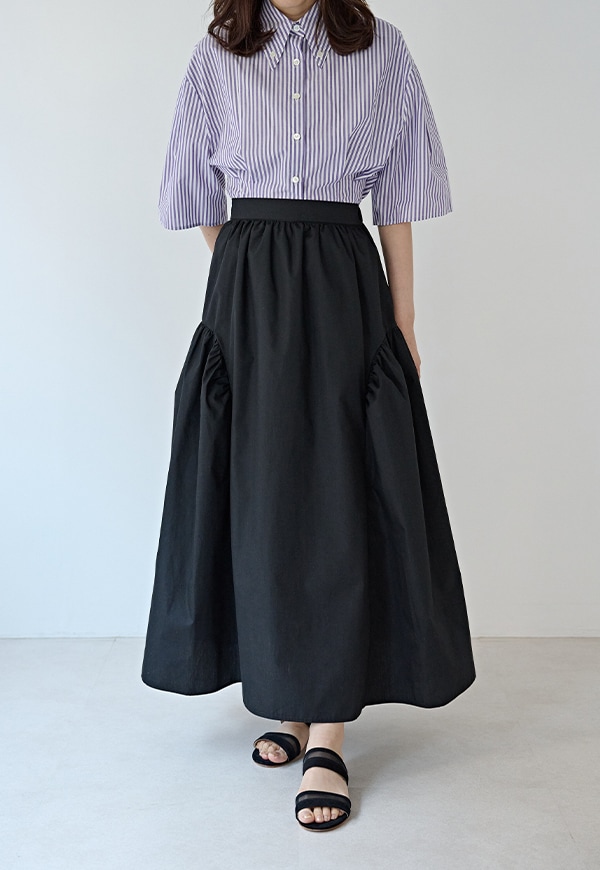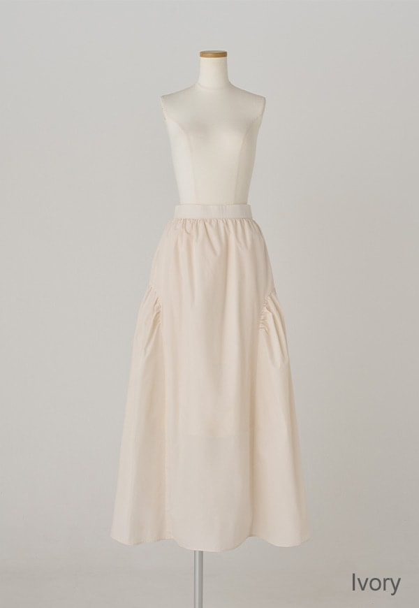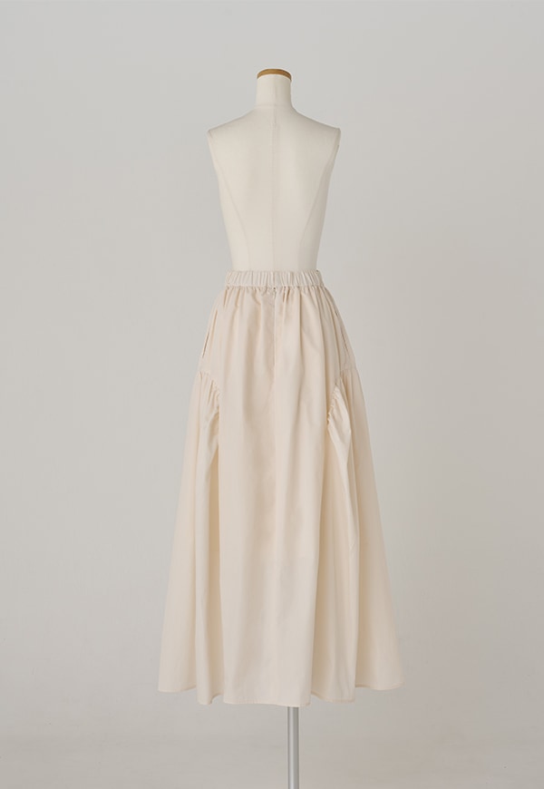 サイドを山状に切り替えて、ギャザーを入れることで独自のシルエットを構築したギャザースカートです。ベルトの後ろ部分はゴムが入っているので、着用した際にウエストが伸び、ストレスが少ない仕様になっています。透けを考慮して裏地付きとなっています。