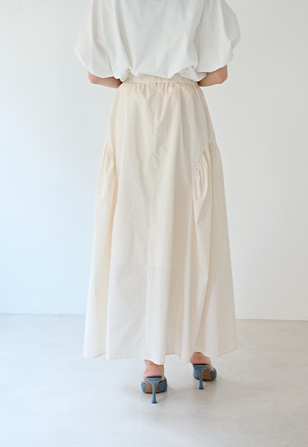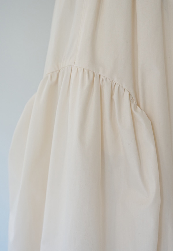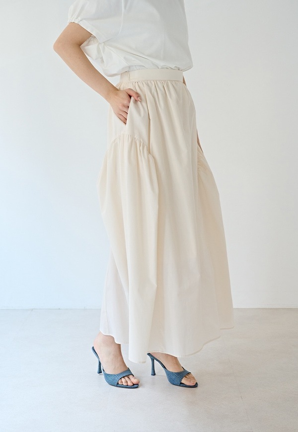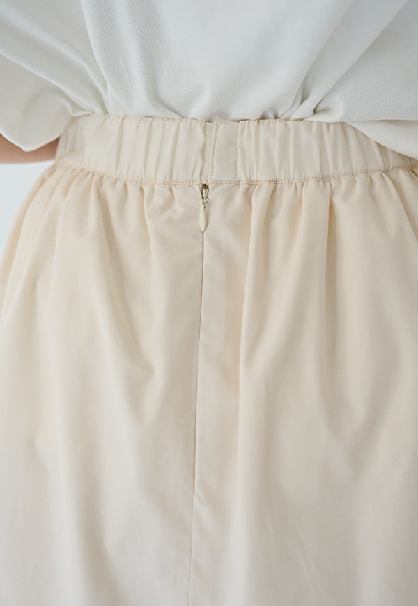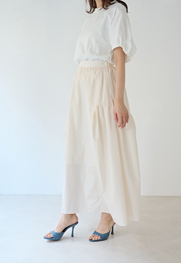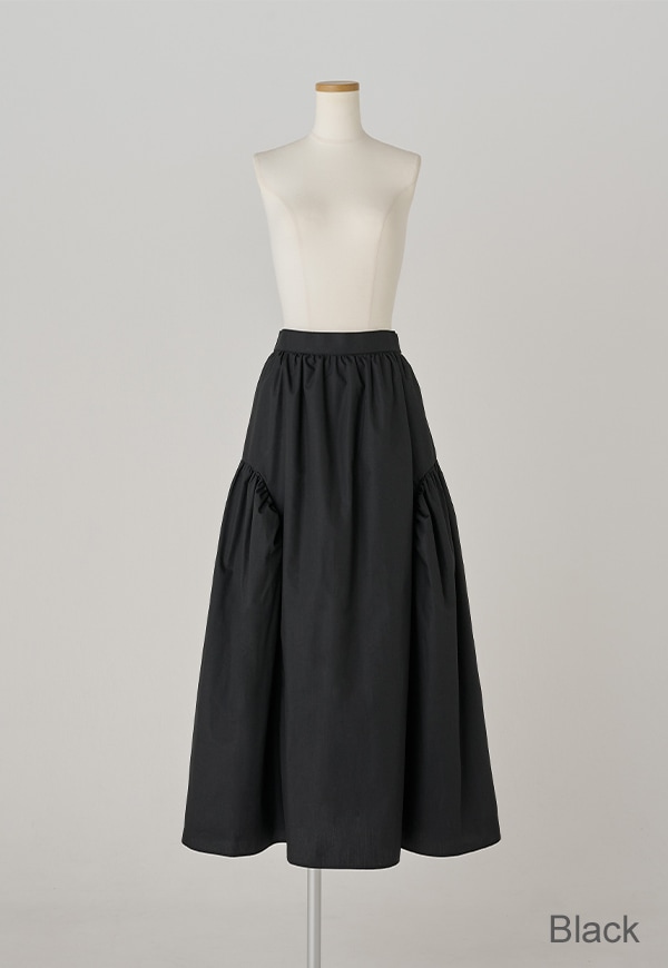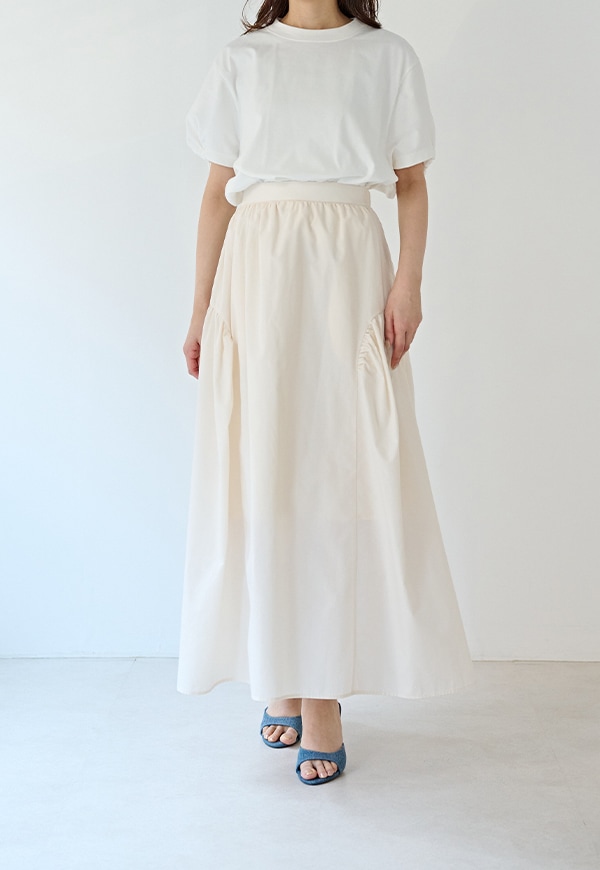 サイドを山状に切り替えて、ギャザーを入れることで独自のシルエットを構築したギャザースカートです。ベルトの後ろ部分はゴムが入っているので、着用した際にウエストが伸び、ストレスが少ない仕様になっています。透けを考慮して裏地付きとなっています。