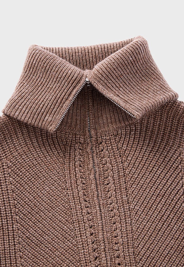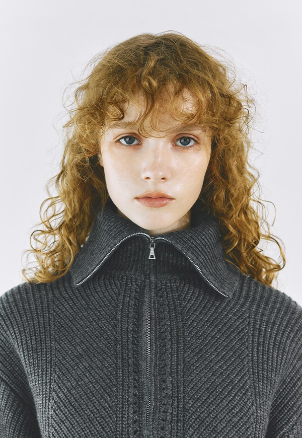 フロントジップの締め具合でスタンドカラーにしたり、大きく開けて衿を折り返してもご着用いただけ、顔まわりを華やかに演出します。